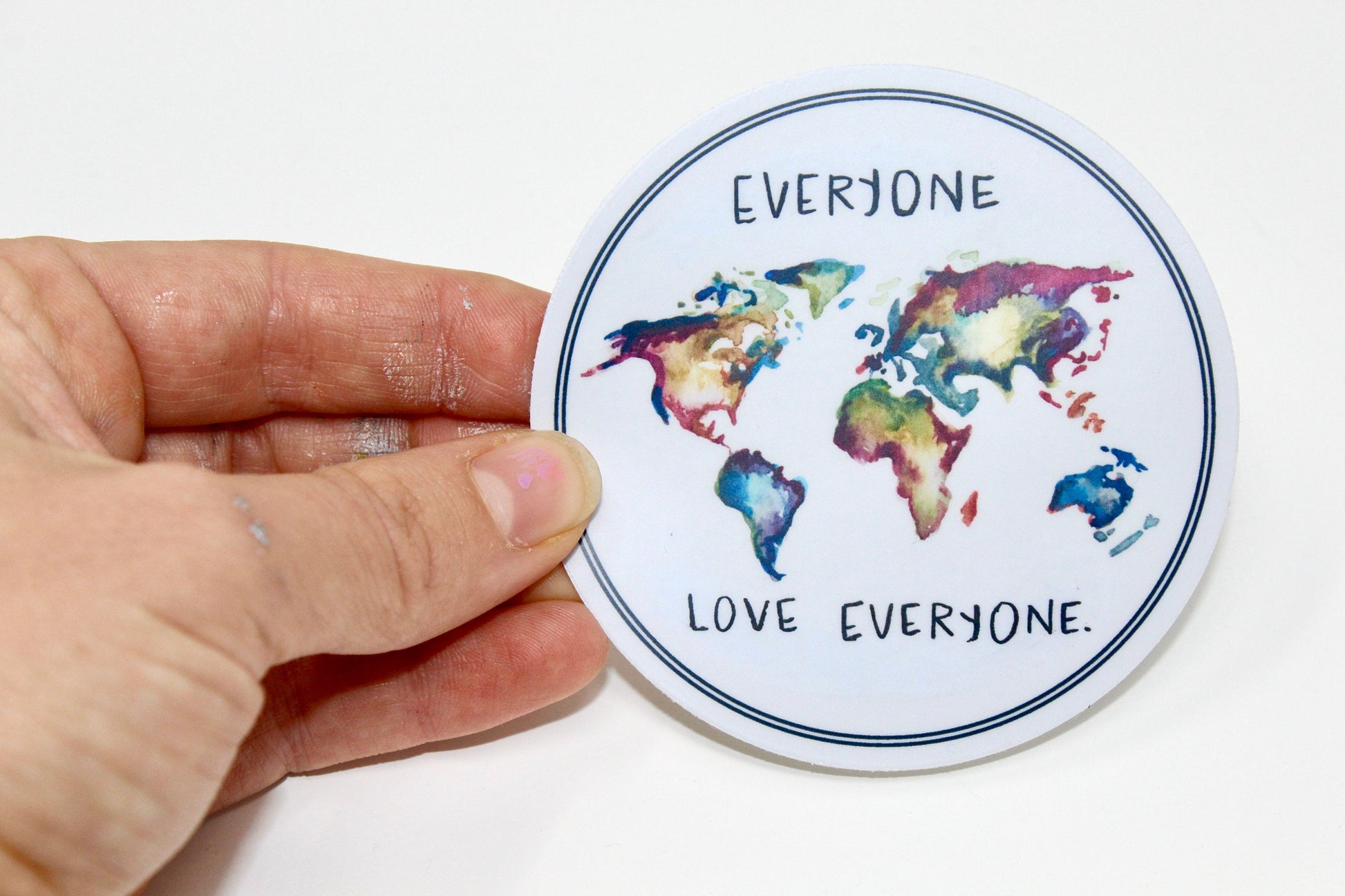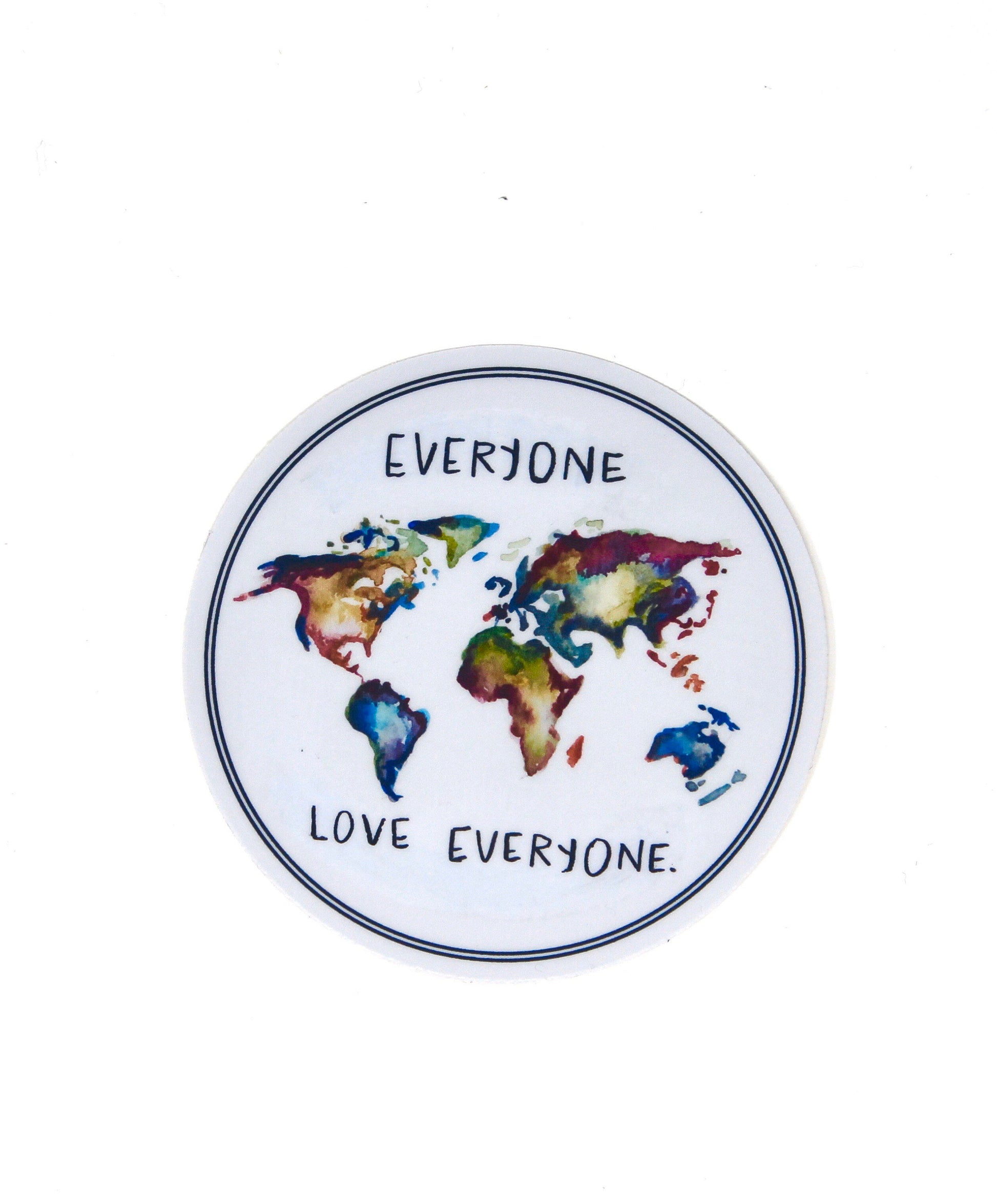 Spread a message of love with this 'Everyone Love Everyone' decal. Featuring a stylized world map originally painted in watercolor, this decal is perfect for free spirits, globetrotters, or anyone looking to add a pop of color with a meaningful, unifying message to any surface.