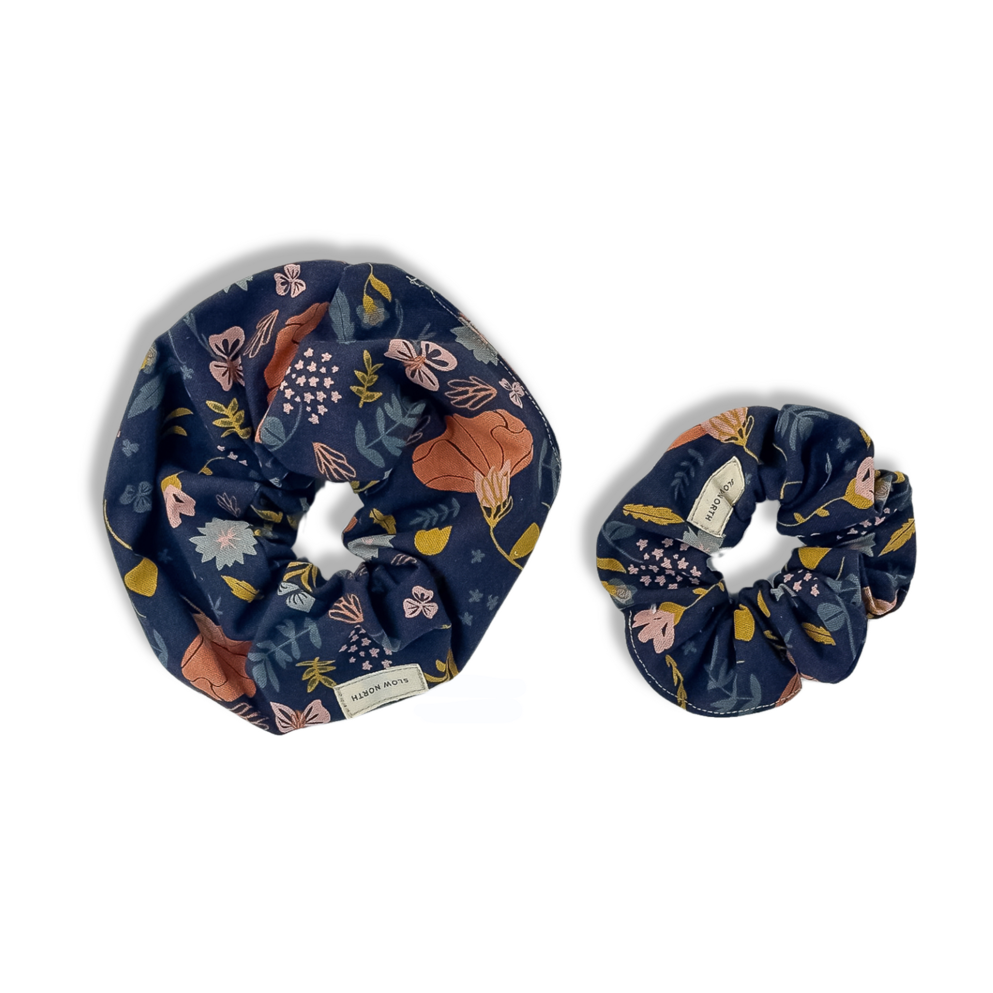 Featuring a whimsical, floral blend of vintage navy, mustard yellow, light pink, and sage blue hues, these hair scrunchies are upcycled and crafted from remnants of our small-batch manufacturing process in Austin, TX.
