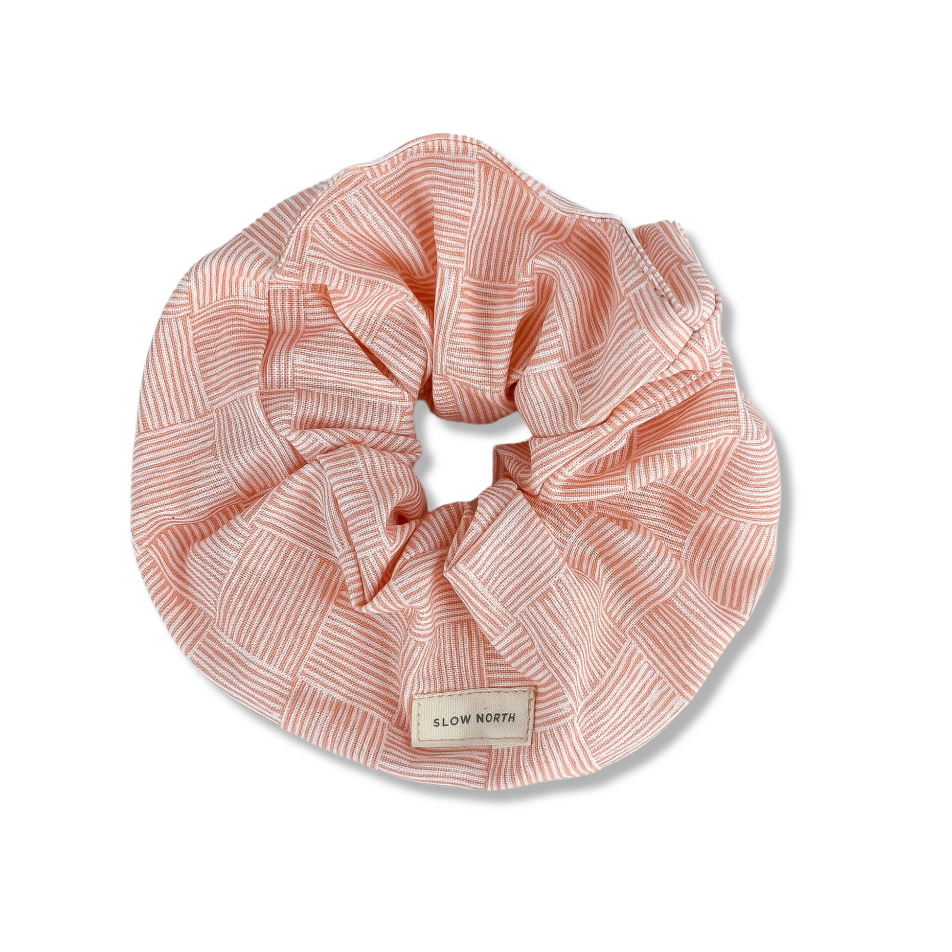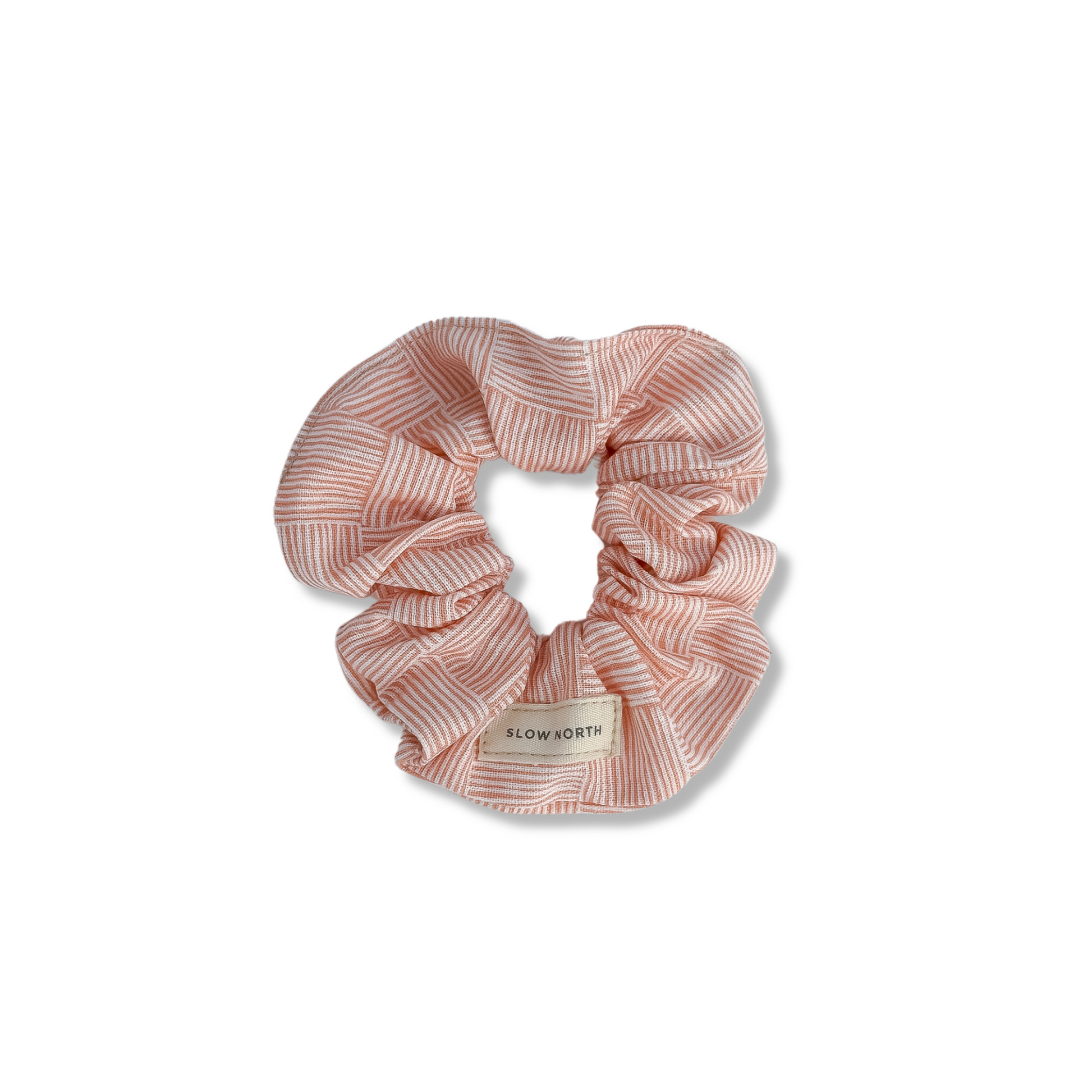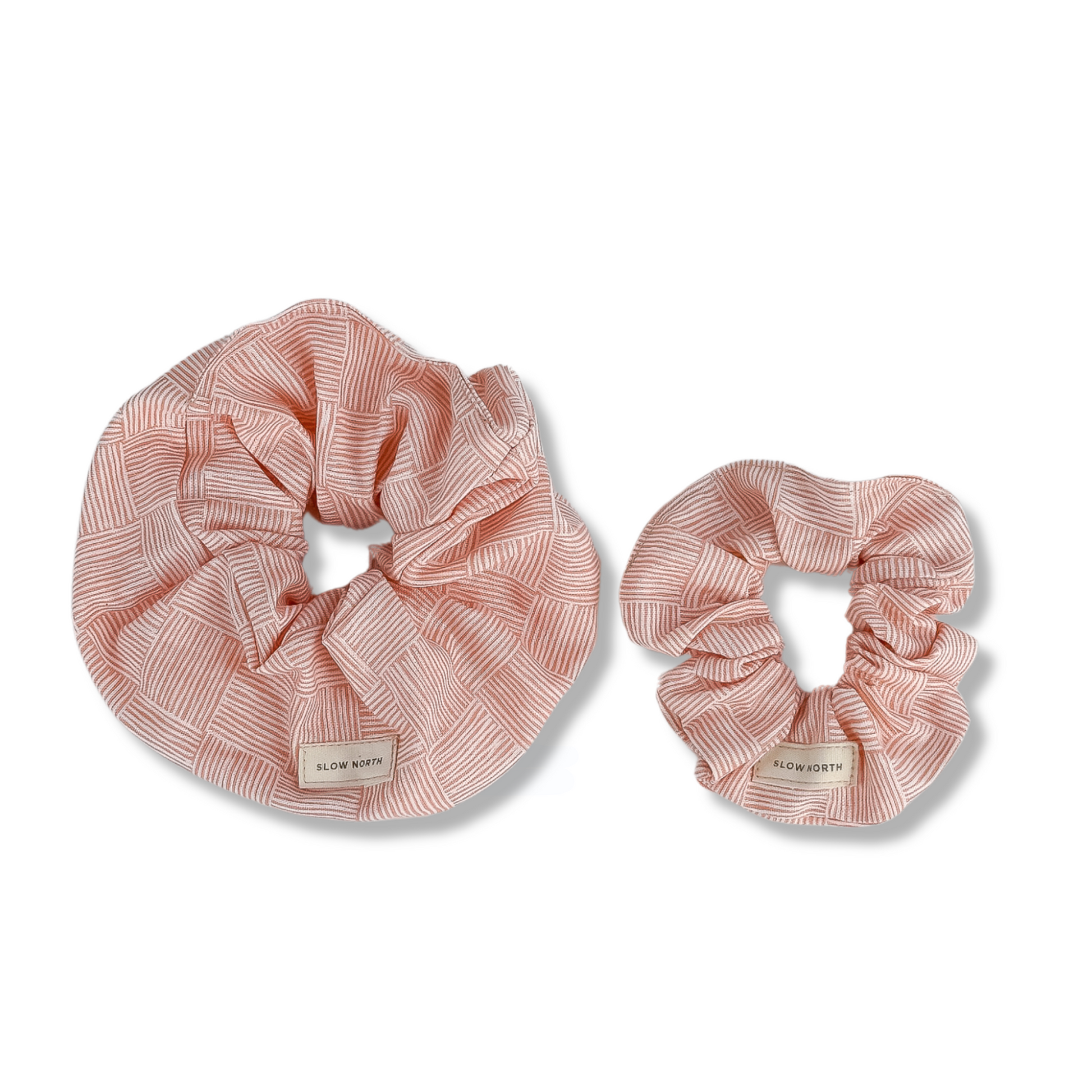 Featuring a classic feminine pattern of light pink and linen, these hair scrunchies are upcycled and crafted from remnants of our small-batch manufacturing process in Austin, TX.