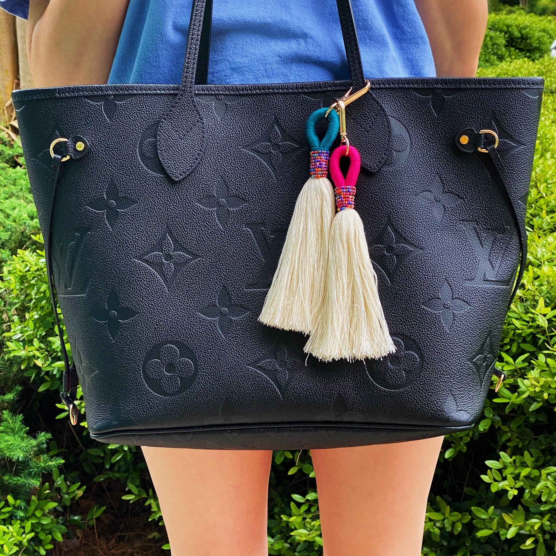 Absolutely beautiful tassel key chain in jewel beaded details and colorful threaded accent! Extended length and fuller tassel to make this key chain a perfect trendy statement piece