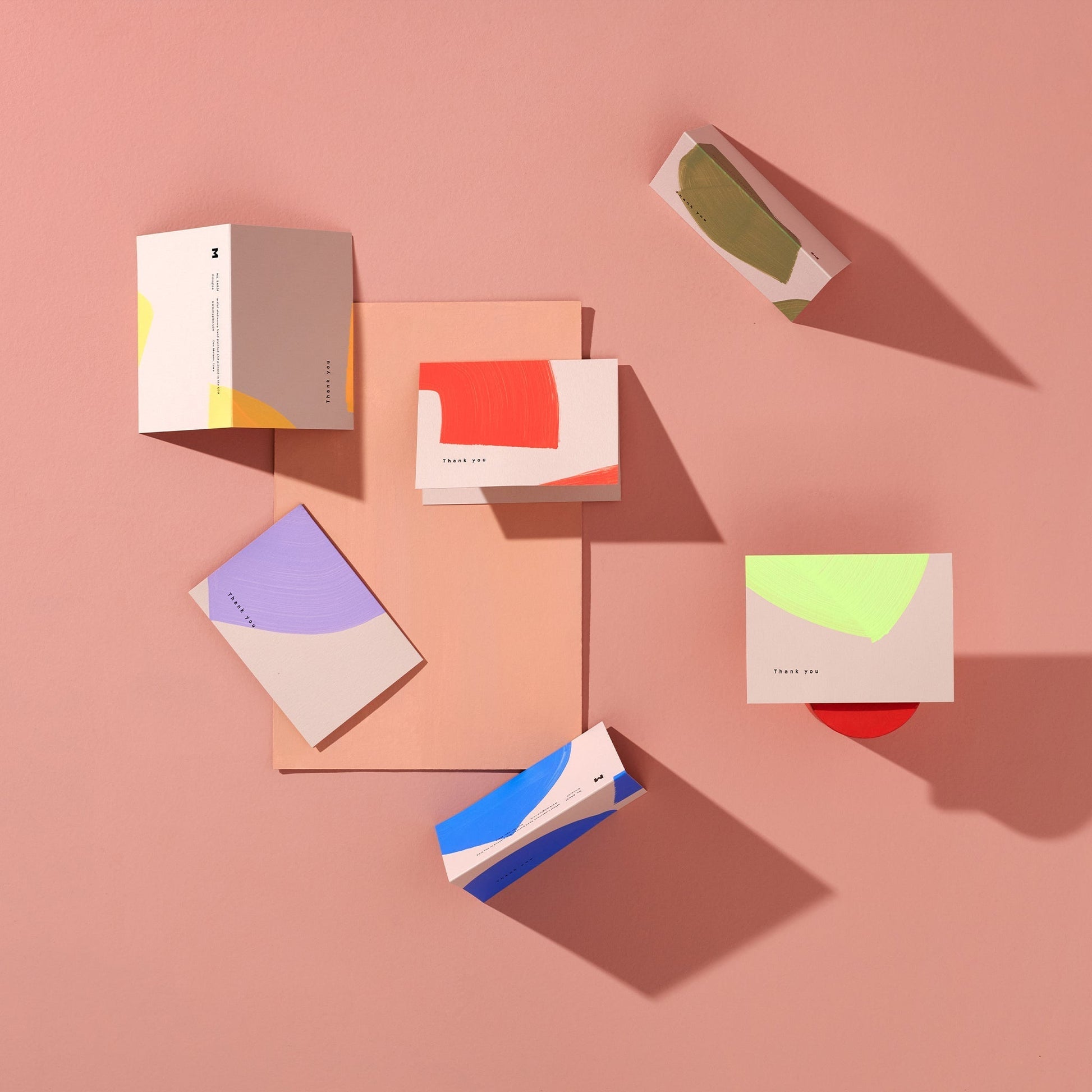Six assorted hand-painted folded cards with neon bright acrylic paint and black foil. 6 different colors in each set. Painted shapes will vary and each set will be one of a kind. Paired with a gray envelope.